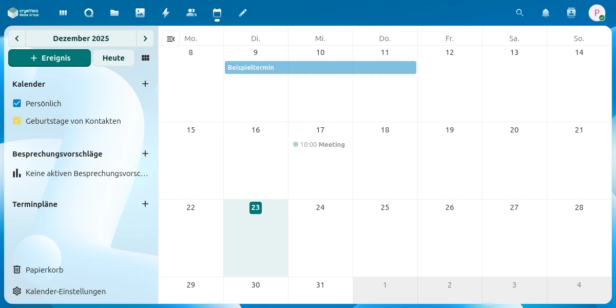 Just like contacts, you can manage appointments directly in the cloud and synchronize them with your devices and software via CalDAV.