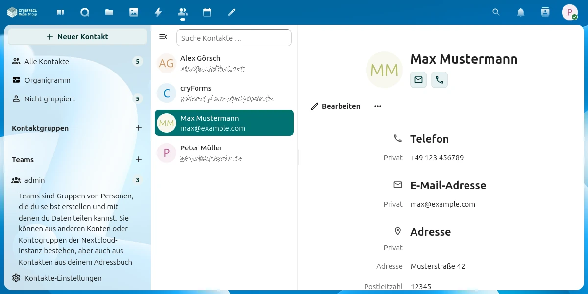 Manage contacts centrally without sharing them with big tech companies. Your contacts remain truly yours.