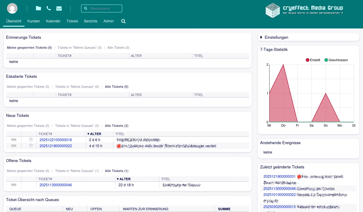 With OTOBO, the software we use, you can receive support requests by email or via a web interface and process them efficiently. Each request becomes a “ticket” that is assigned and tracked.