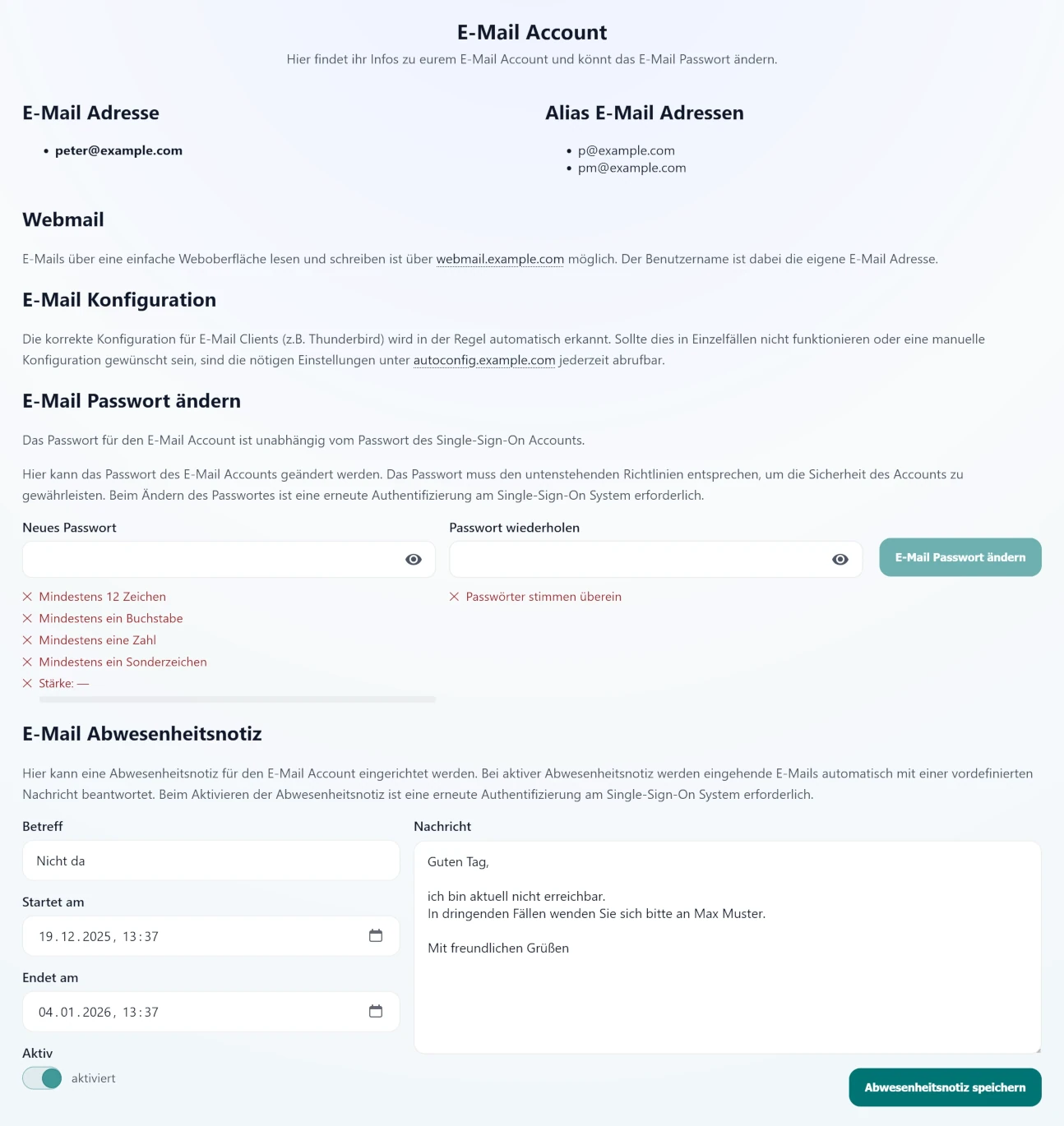 Zudem haben Sie die Möglichkeit ganz bequem das Passwort für Ihr E-Mail Konto zu ändern, oder eine Abwesenheitsnotiz für automatische Antworten zu hinterlegen.