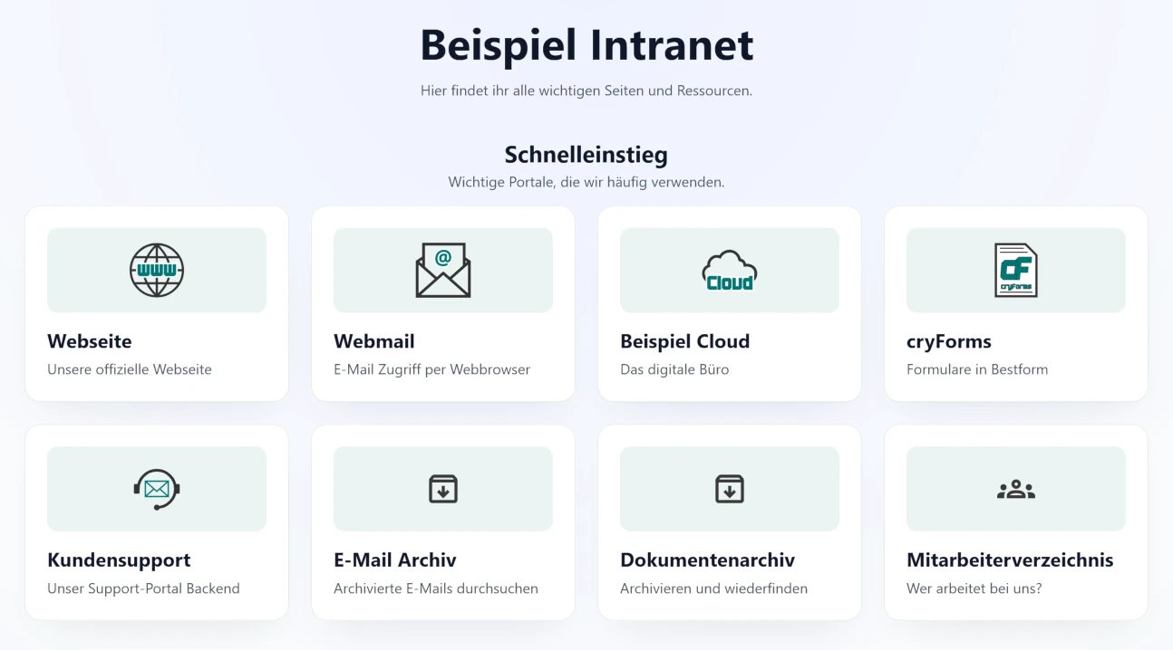 Ein Intranet ist eine interne Webseite, die nur für Mitarbeiter oder bestimmte Gruppen innerhalb eines Unternehmens zugänglich ist. Es dient als zentrale Anlaufstelle für Links, Informationen und interne Ressourcen.
